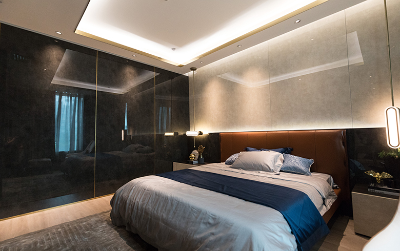 臥室護墻系統兩面采用深淺對比色,高亮光護墻板拼接,非對稱均衡設計,幾何線型簡雅觀感,造就輕快、高雅、奢華的生活品味。