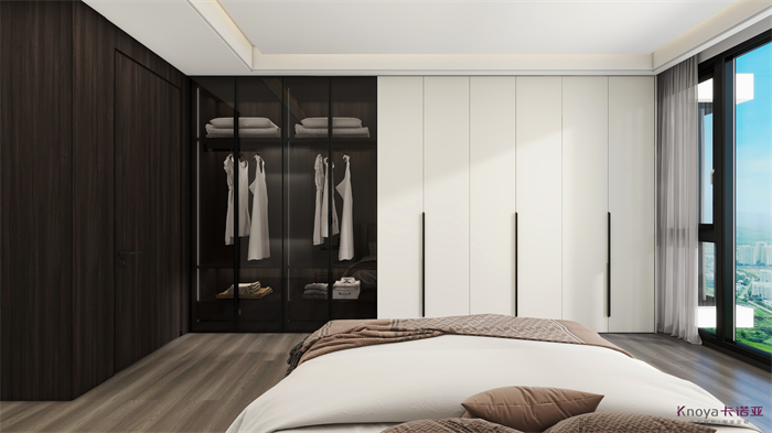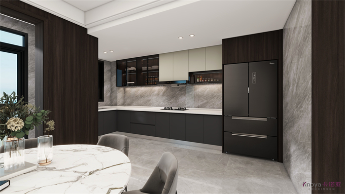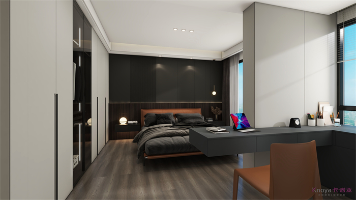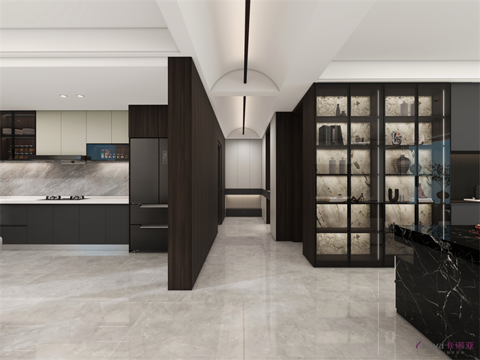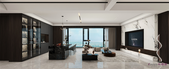 設(shè)計(jì)方案是一個(gè)意式簡(jiǎn)約風(fēng)的大平層,門板材料主要是以水性漆為主,客廳空間因?yàn)楦脑旌罂缍缺容^大,光線比較好,所以我們采用部分深色的墻面來搭配淺灰色的地板,讓空間大氣不失沉穩(wěn)。