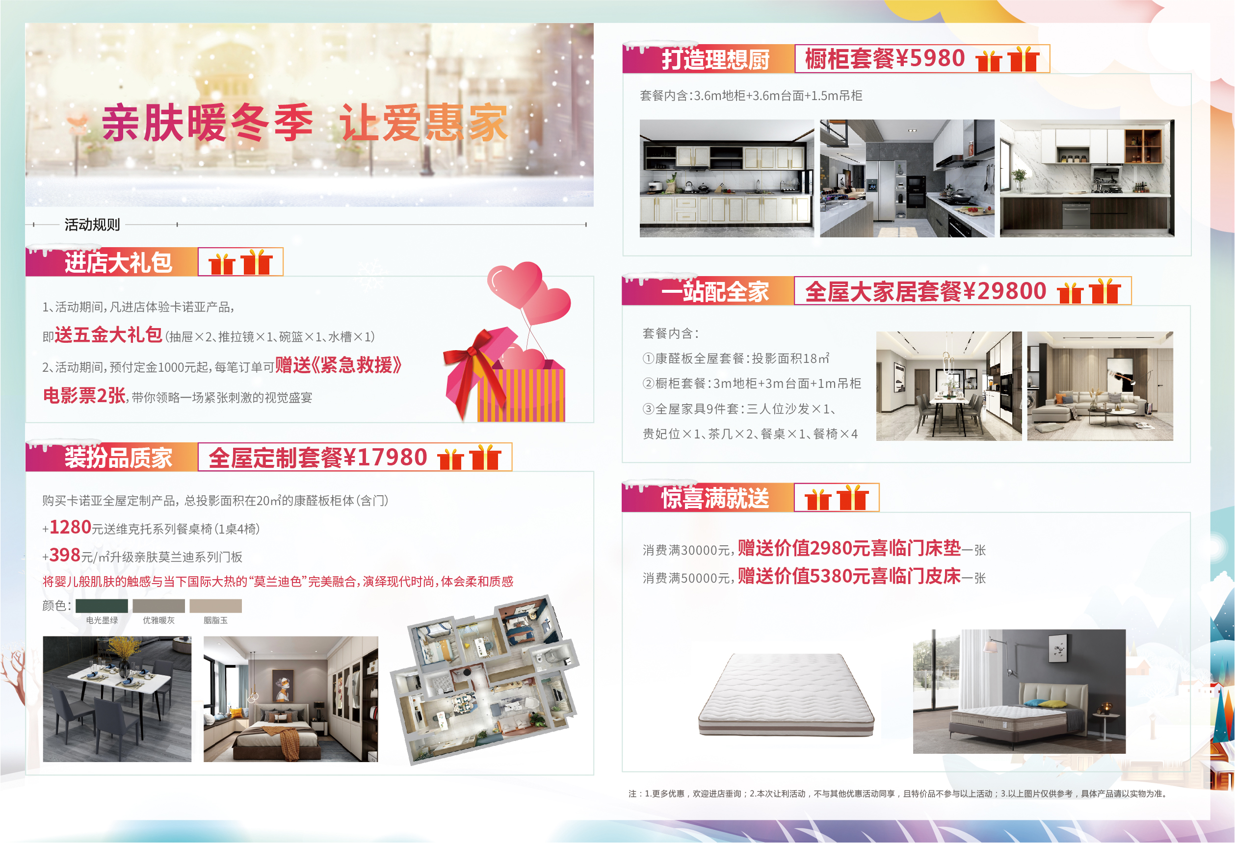 對于有房一族來說,最頭疼的事情就是家裝了,不僅費力耗時,還未必能選到滿意的家裝。為了讓每位業主都可以在新年住進自己夢想的“定制家”,卡諾亞推出“親膚暖冬季,讓愛惠家”辭舊迎新活動,3大套餐全面升級,讓您省薪輕松住進“定制家”。